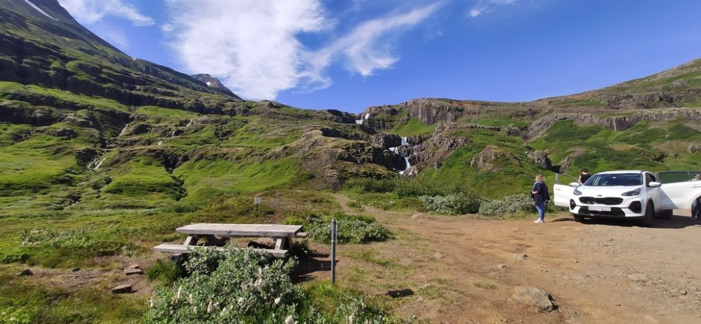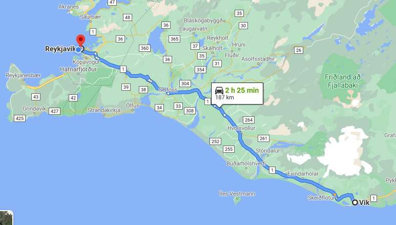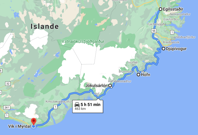 Au centre de l’île, ce sont des glaciers, des volcans, il n’y a pas de route praticable (ou très peu). Il n’y a pas de train en Islande, juste des voitures et des bus. Les limitations de vitesse sont de 50 en ville et max 90 sur les autres routes. Une route fait le tour de l’île, c’est la route 1.
